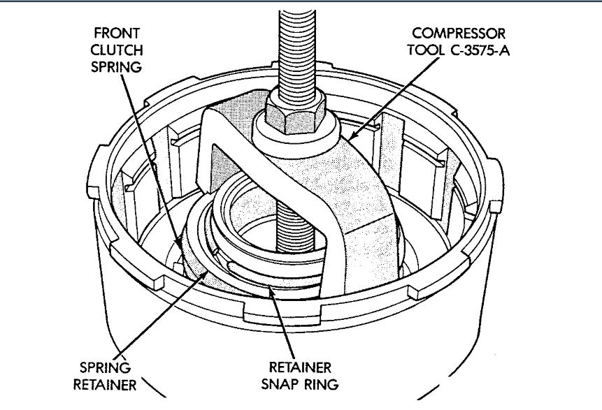 2. Compress clutch piston spring with Compressor Tool C-3575-A, or equivalent. Be sure legs of tool are seated squarely on spring retainer before compressing spring.