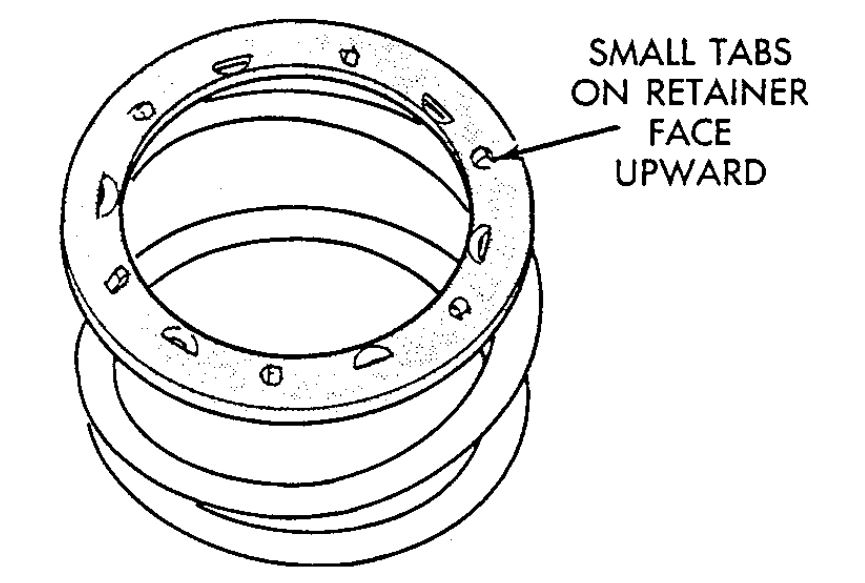 6. Position spring retainer on top of piston spring. Make sure retainer is properly installed. Small raised tabs should be facing upward. Semicircular lugs on underside of retainer are for positioning retainer in spring.