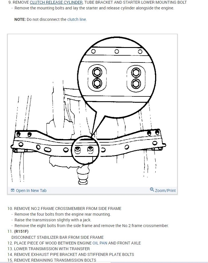 11. PLACE PIECE OF WOOD BETWEEN ENGINE OIL PAN AND FRONT CROSSMEMBER