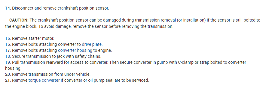 Here is the transmission replacement information you requested. Here is a manual transmission tutorial for you to view. Removing an automatic transmission is similar:
