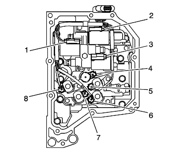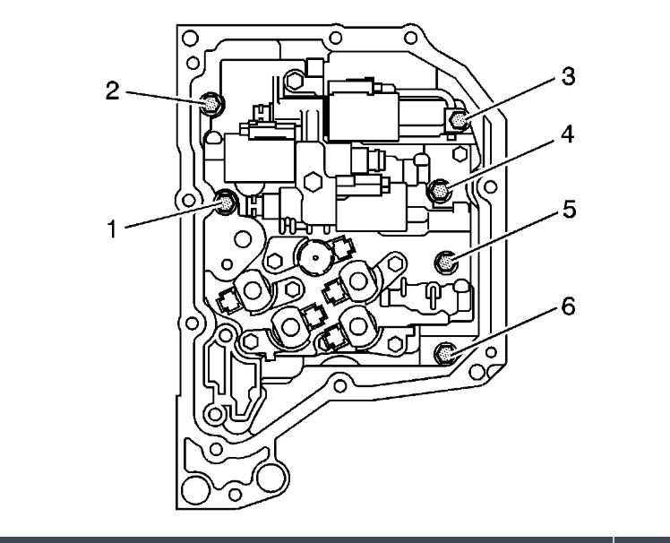 9. Remove the 6 control valve body mounting bolts/screws (1-6).