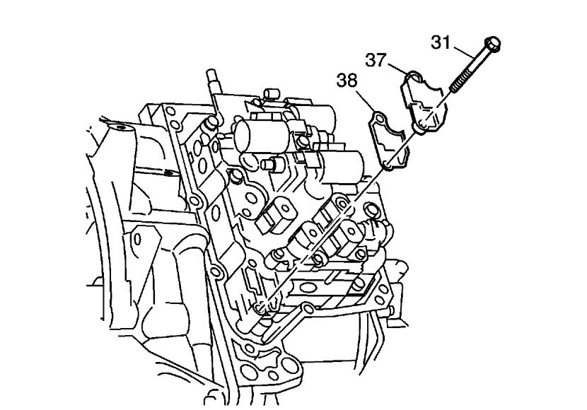 8. Remove the 2 control valve body bolts/screws (31), control valve body fluid passage cover (37) and gasket (38).