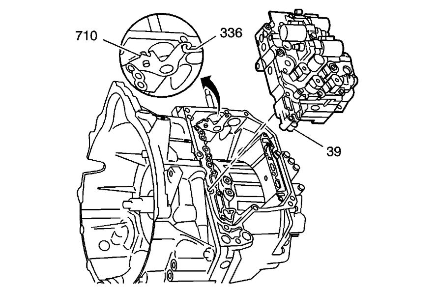 10. While holding the control valve body assembly, disconnect the manual shift detent lever assembly (710) from the manual valve link (336).