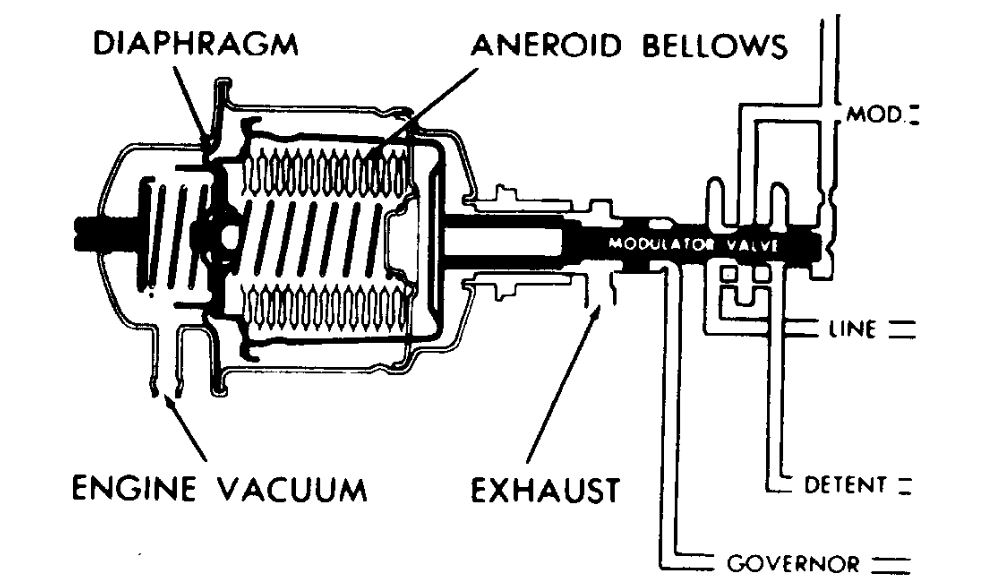 Provides modulator pressure that senses engine torque and vehicle speed. The vacuum modulator speed is used to vary the shift points according to throttle opening and to raise line pressure proportional to engine torque.