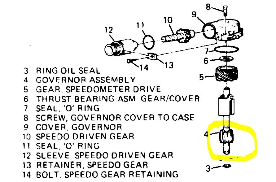 There is a governor that regulates the shifting that is located where the speedometer or vehicle speed sensor is located. The gear I circled usually wears out and does not tun the governor.