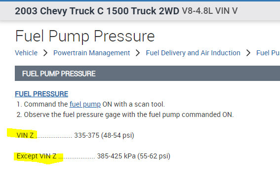 I attached the manufacturer's fuel pressure specifications below. Note: The 8th digit of the VIN is the engine code. It will be either a Z or something other. Take note of the pressures based on the VIN engine code.