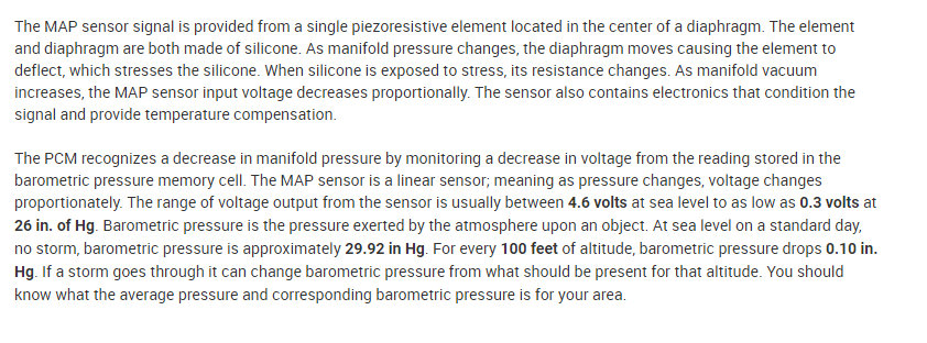 The MAP sensor is used as an input to the Powertrain Control Module (PCM). It is a sensor helps the PCM control the air / fuel mixture ratio. Which helps the PCM determine the amount of fuel that the engine will need as well as spark advance.