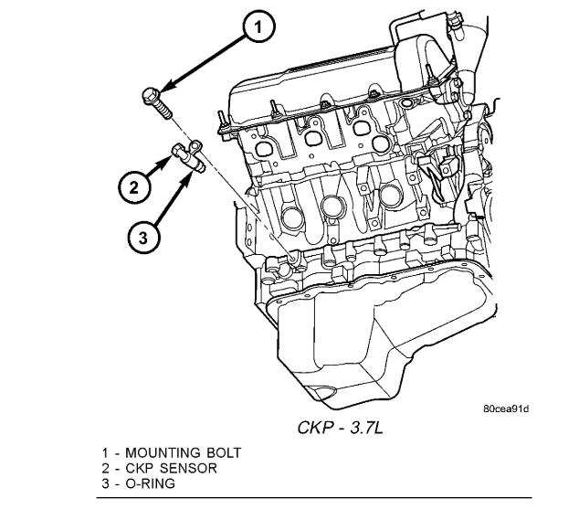The Crankshaft Position (CKP) sensor is mounted into the right rear side of the cylinder block. It is positioned and bolted into a machined hole.