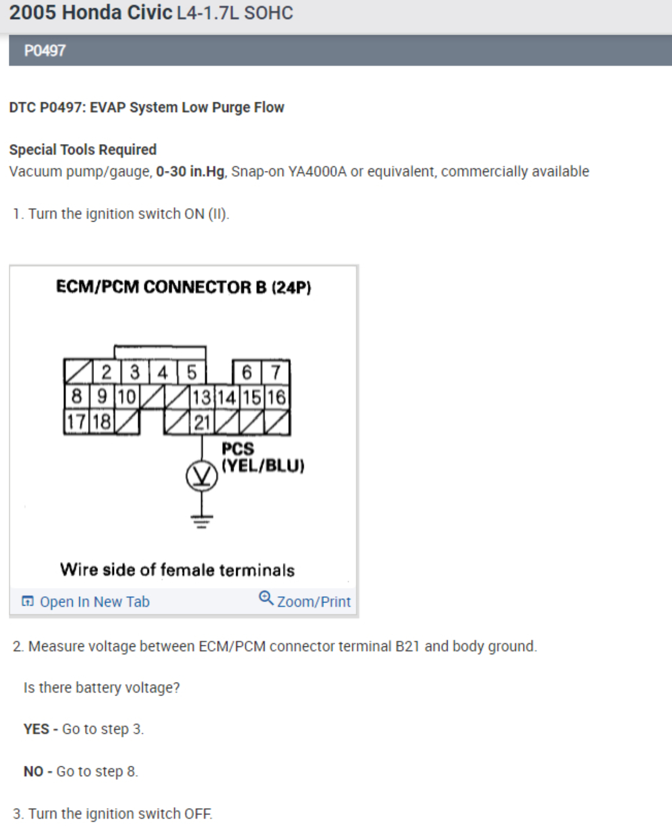 After doing a search I found a post on this website and a solution by @SQM (https://www.2carpros.com/questions/2005-honda-civic-engine-code-p0497#last) with the troubleshooting steps to diagnose the source of the problem. The steps are very detailed, and I appreciate SQM input. The only doubt I have is related to the steps that require you to measure voltage or jump a connector terminal to body ground. For example, if you look at the post linked above and the image containing step 1 (image #3) or step 5 (image #5); Is that action done while the connector is plugged into the ECM/PCM or should I pull the plug out and then do the required action.