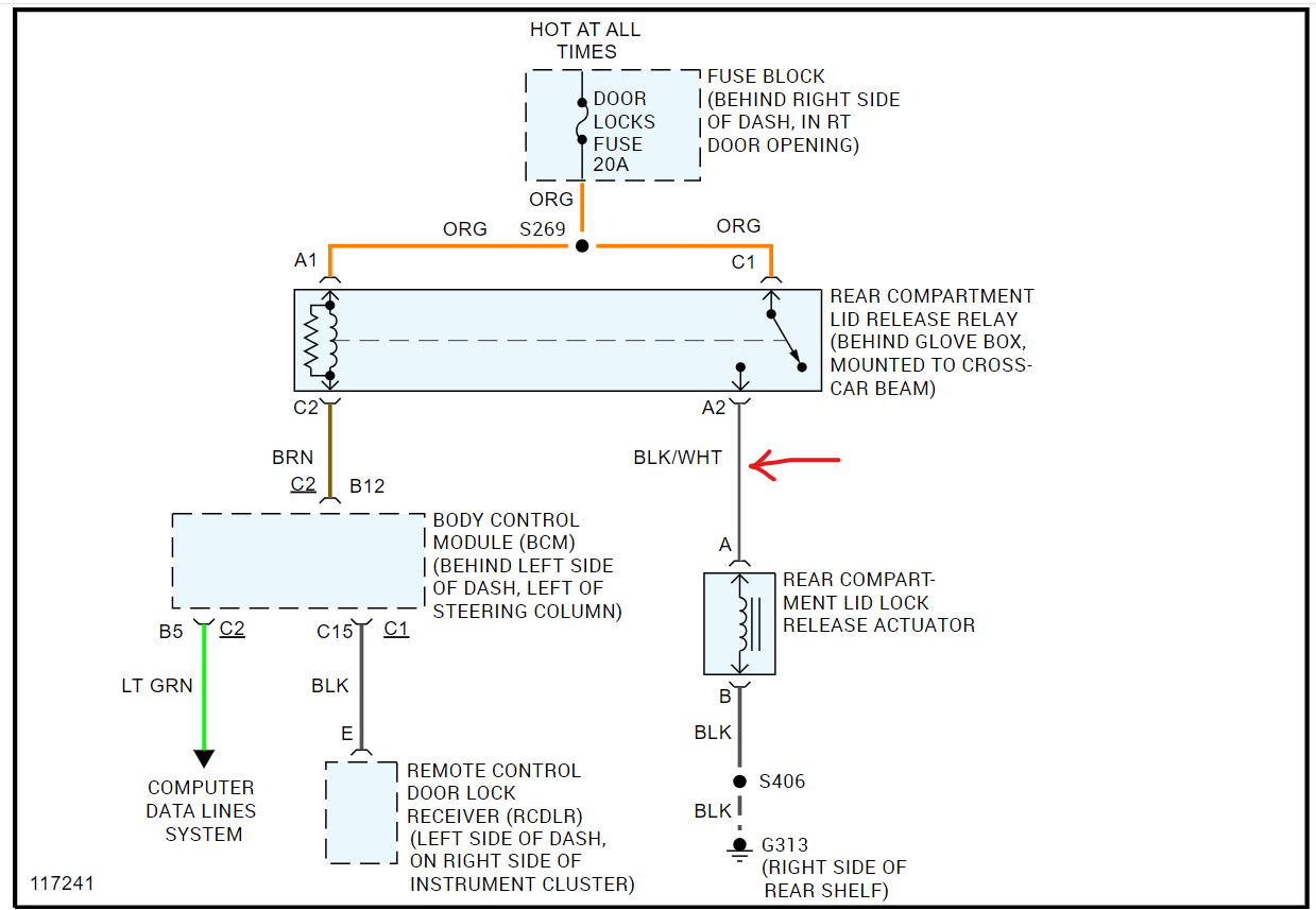 Please let me know if, and where in the diagram I can find the right wires/connections so I can mount a small button in the dash, and by pushing it: a miracle, the trunk opens!