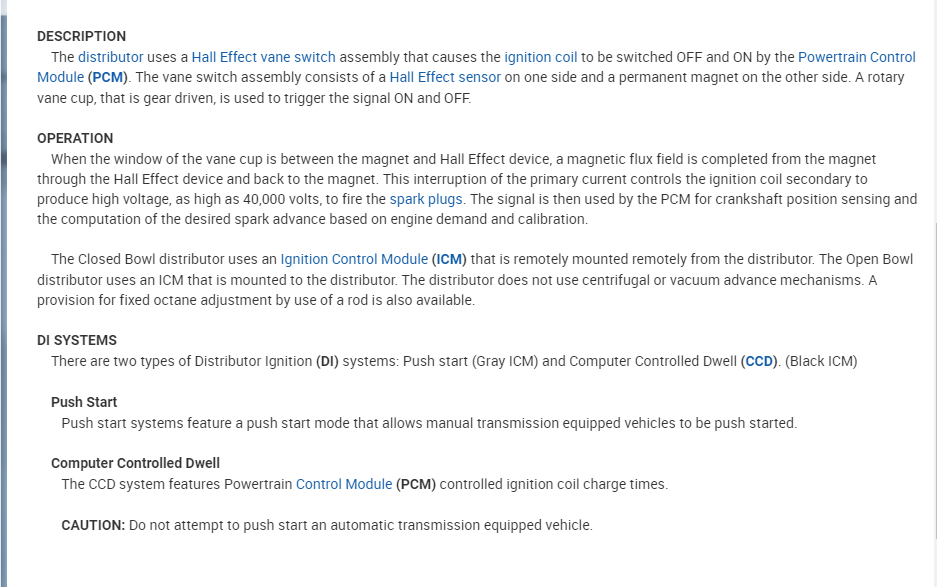 If you take a look at the attached documents, it will explain how this system works. If we can confirm that there is no spark then we know we are on the right path. Please pay particular attention to the statement where it says the distributor has a Hall Effect switch that controls the coil. These hall effect sensors and switches have a propensity to fail when they get hot. Normally this is found with crank sensors as they are hall effect as well but your truck does not have a crank sensor but it does have this switch.