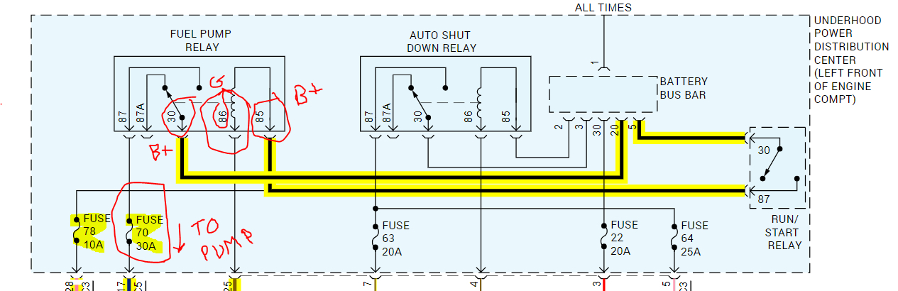 If you look below, I attached a pic from the schematic. Check fuses 70 and 78 in the underhood fuse box. If they are good, remove the relay and locate connector pins 85 and 30 for the relay. Connector 85 should have power when the run start relay is closed. Check if that is the case.
