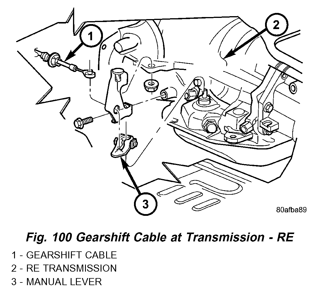 3. Disengage cable eyelet at transmission shift lever and pull cable adjuster out of mounting bracket (Fig. 99) or (Fig. 100).