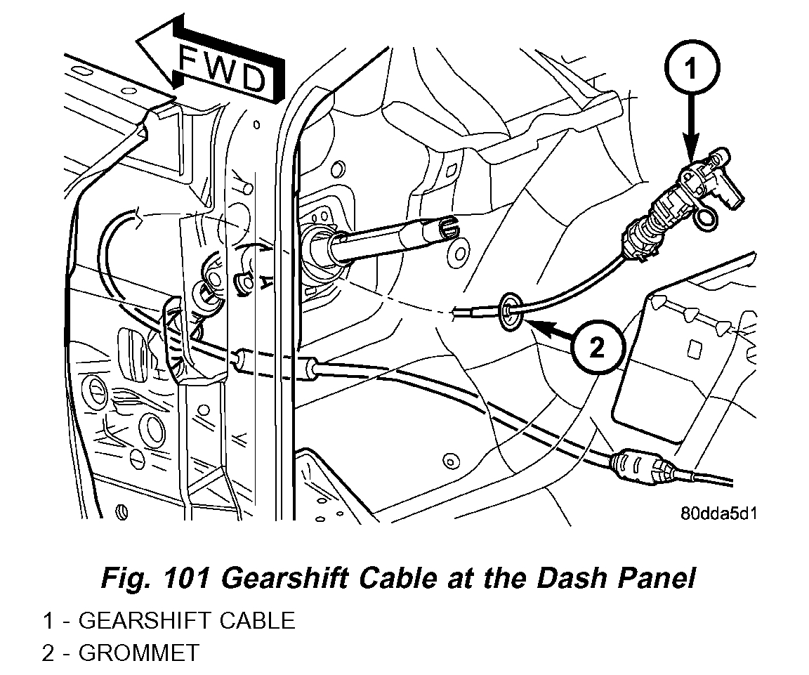 5. Remove the dash panel insulation pad as necessary to access the gearshift cable grommet (Fig. 101).