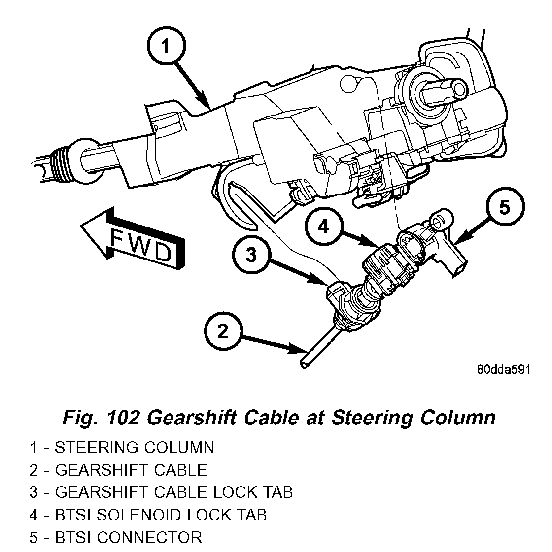 3. Snap the cable into the steering column bracket so the retaining ears (Fig. 104) are engaged and snap the cable eyelet onto the shift lever ball stud.
