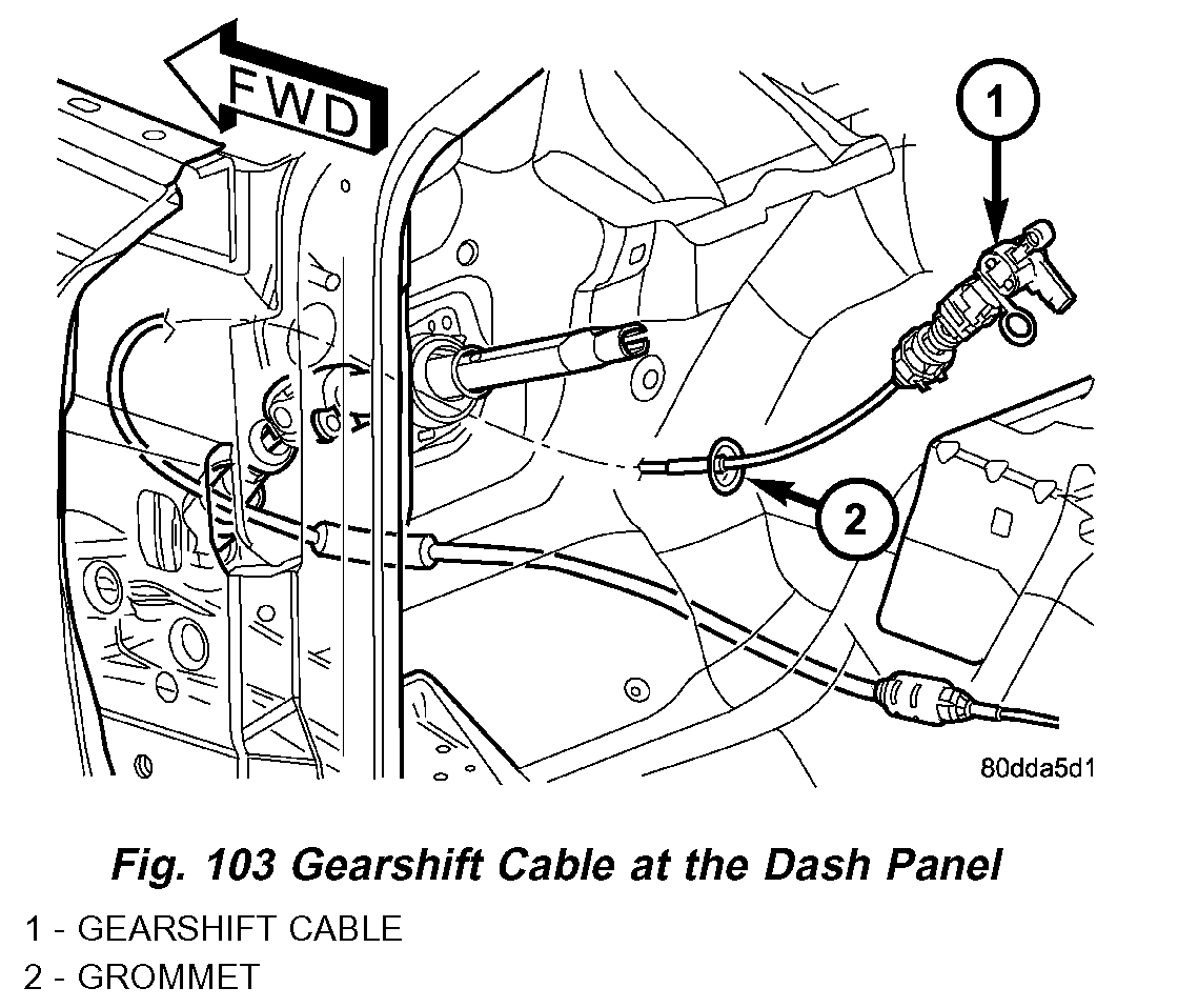1. Route the transmission end of the gearshift cable through the opening in the dash panel (Fig. 103).