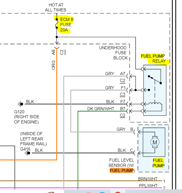 Let's try this. In the under-hood fuse box, you will find an ECM B fuse and the fuel pump relay (see pic 2). Remove them and inspect where they connect to make sure nothing is corroded, pushed in, or damaged. If everything appears good, switch that relay with a different one in the box that has the same part number. See pic 2 for fuse/relay location.