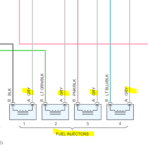 If you look below, I attached a schematic showing the injectors. See pic 3. Each injector has a gray wire. Check for power at each injector's gray wire with the ignition key in the run position. You should have power.