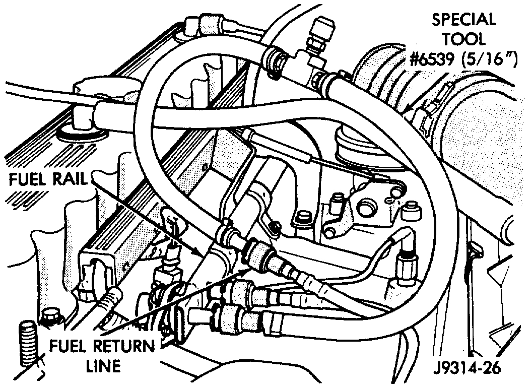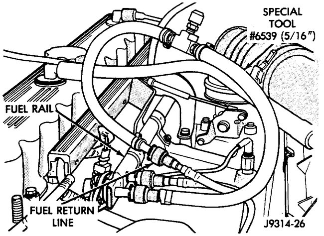 Connect Fuel Line (Tube) Pressure Test Adapter Tool number 6539 (5/16 in.) between the disconnected fuel return tube and fuel rail.