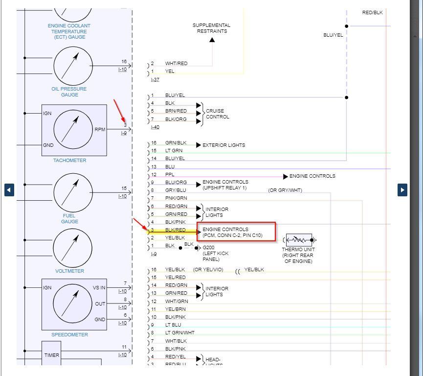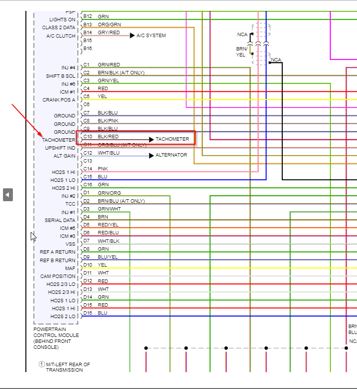 I assume you are looking for the engine speed/tach wire? If this is the case the color is black/red coming from the PCM to the cluster.