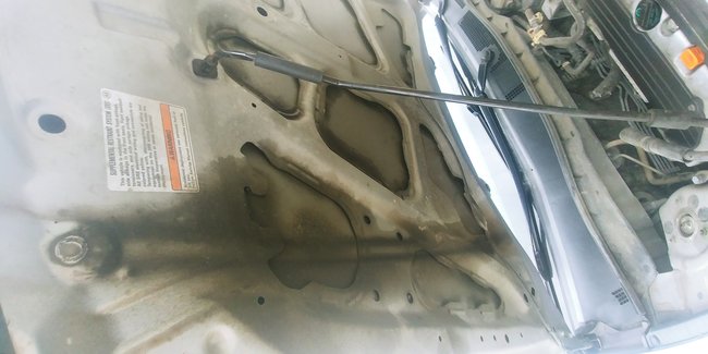 I would assume there is some fluid dripping onto the belt/s and the belt/s is throwing that fluid onto the underside of the hood. No need to trade it in just because of that. See what is leaking and fix the leak. Then power wash all that fluid off the underside of the hood and engine area.