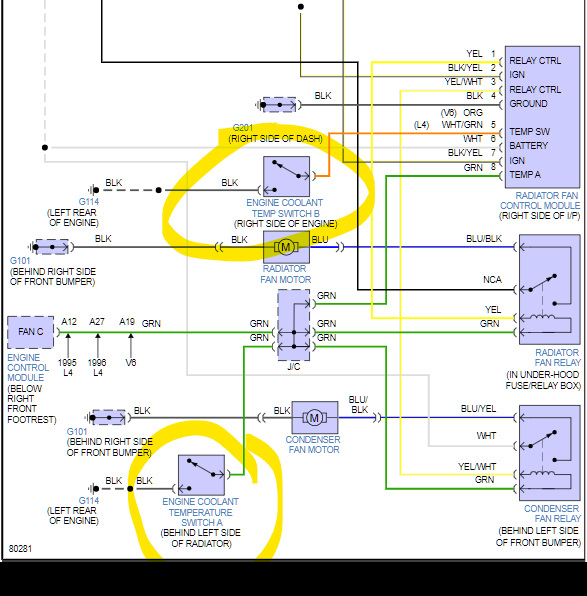 Is the wire broken or is the check engine light on? It's most likely just one of the thermal switches for the radiator fan control module. The aftermarket wiring diagrams are not always the same exact colors. But a 1 wire switch running right next to the thermostat is going to be a heat related on/off switch. Or its the Ground for one of the thermal switches. The Engine Coolant Temp Switch B grounds at the left rear of the engine which is right where your hand is. Your car has a transverse engine, meaning its sideways in the engine compartment. Your main drive belt is on the right side when facing the car, correct? (Driver side) that is technically the front of the engine.