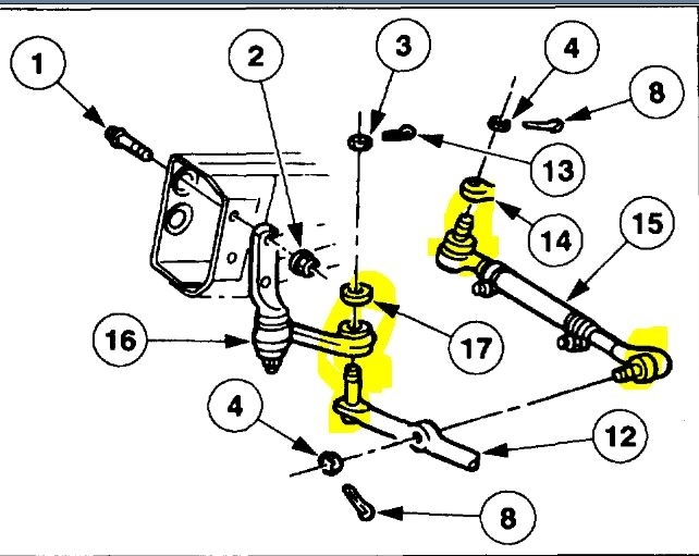 If you look at pic 1, I highlighted the sector shaft and the drag link joints. Check them for play. Pic 2 shows the idler arm and a tie rod. Note that there are tie rods on both sides of the vehicle. All need checked.