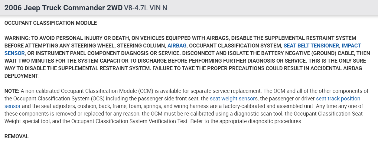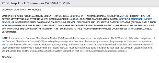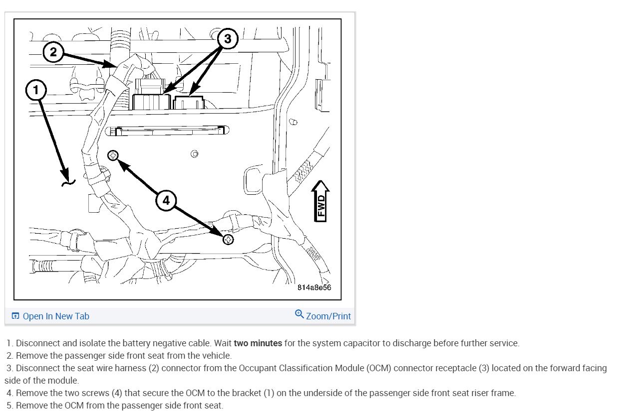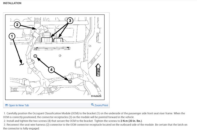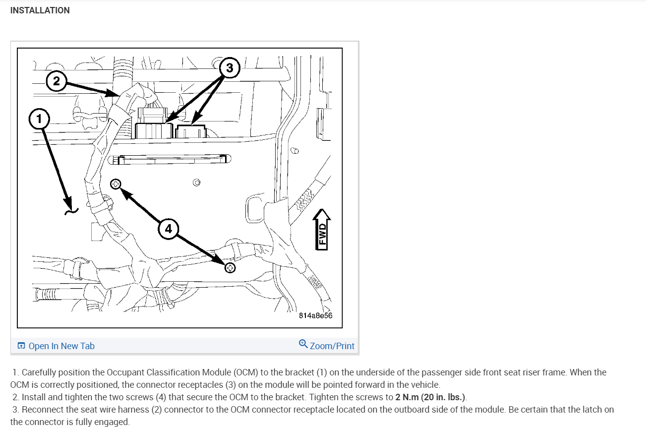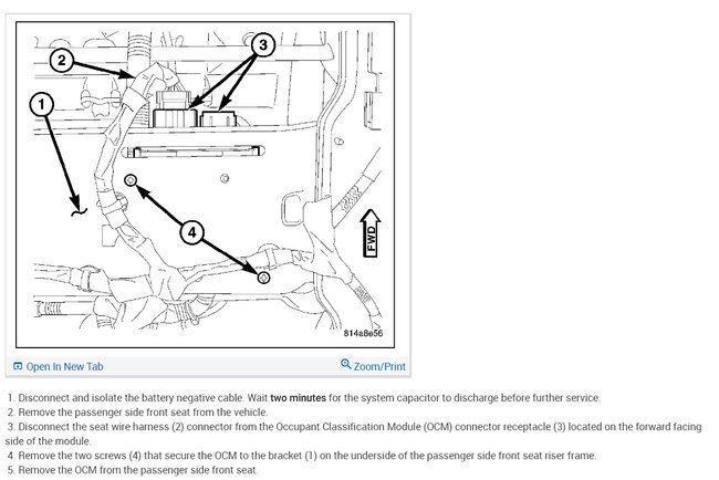 I purchased a salvaged the vehicle listed above and it was missing the front passenger side seat. Under the seat resides the OCM (Occupant Classification Module). I purchased a used seat with a used OCM and installed it. After installation, I got an airbag warning on the dash, so I checked with my code reader and getting a B2206-Current VIN Missing/Mismatched DTC. The used OCM has the VIN from its original vehicle and it does not match the VIN of my vehicle. After reviewing the Mopar shop manual, the fix for this appears to be to purchase a brand new OCM and seat kit (about an $800.00 part) and have the dealer install and program the virgin OCM with my VIN. However, the dealer service told me that if the VIN in the OCM could be updated with my vehicle's VIN, the DTC should go away. I am trying to see if someone can tell me which (if any) of the diagnostic tools (Snap-On, Autel, etc) can rewrite the VIN in the OCM. I also have the option of pulling the module and finding somebody to update the EEPROM where the VIN resides, but that's a lot more work--and so, far, I haven't found someone that is willing to do that, either. Thanks much.