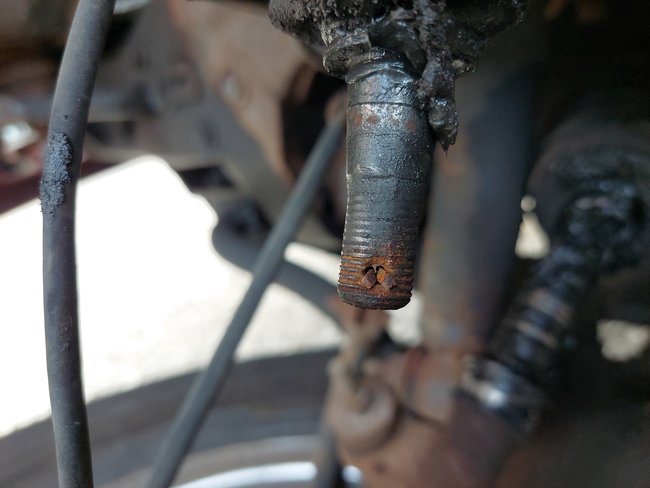 Dandy photo. Thank you. The cotter pin looks too rusty for only 3,000 miles, unless you live in a state like I do where they throw a pound of salt on an ounce of snow. There's pitting too on the tapered part of the stud. Water had to get in to do that. This looks like the castle nut wasn't tight enough or it didn't pull the stud in far enough to wedge it tightly in place. Be sure to inspect the hole in the spindle for the same problem and replace it if you see that, otherwise the new stud will develop the same condition.