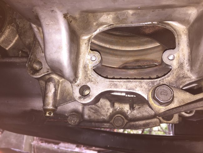 The two 10 mm facing down lock pan to block. Releasing them allows pan to separate from block. Pan drops half an inch or so but no further.