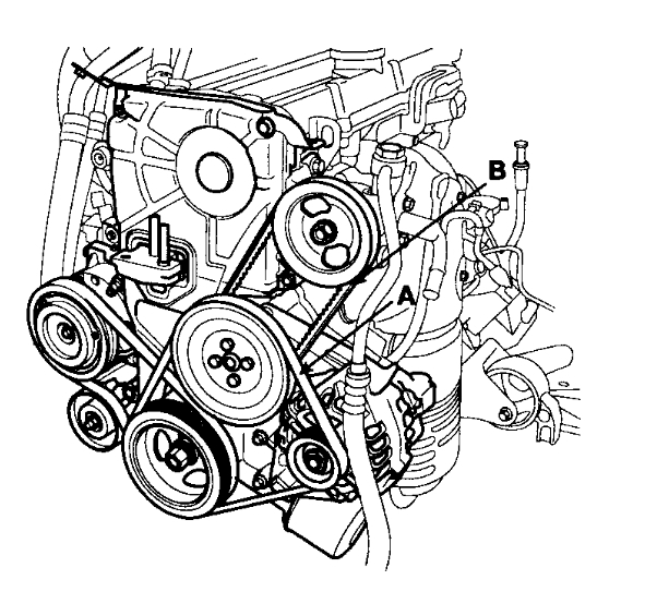 Another belt is specific for the power steering pump, but it is turned by the water pump pulley. (Letter B in pic)