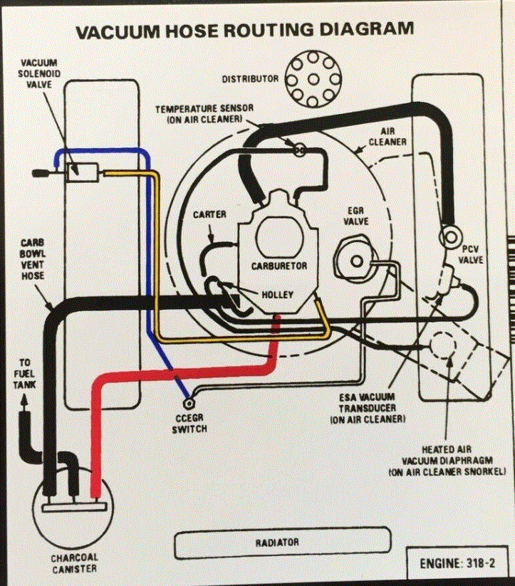I went through my schematics and because of the model year, there was no information. I was able to find the vacuum schematic for a 1974 5.2L Challenger. Take a look at it and let me know if it helps. Also, let me know if you have specific questions.