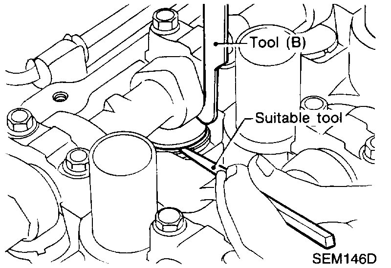 - Tool (B) must be placed as close to camshaft bracket as possible.