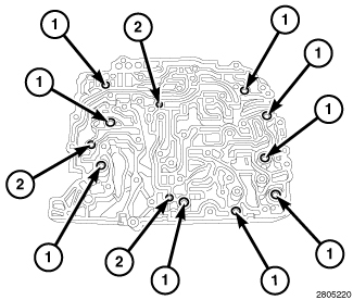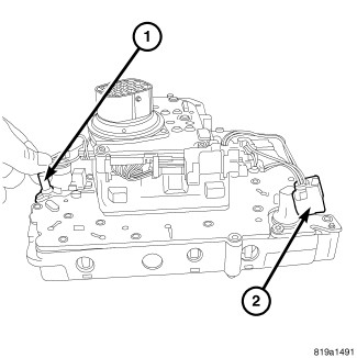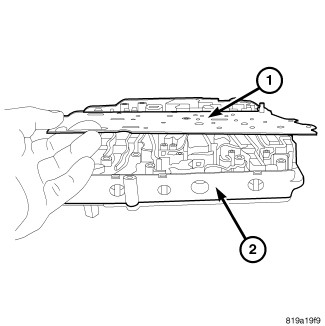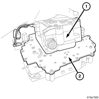 Turn valve body over and remove the solenoid module (1) from the valve body (2).