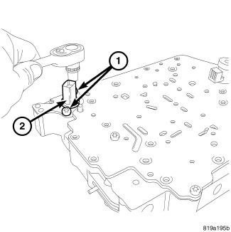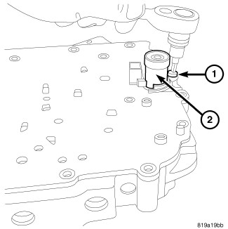 Install the bolt (1) at the pressure control solenoid (2) and tighten to 6 NÂ m (50 in. Lbs.).