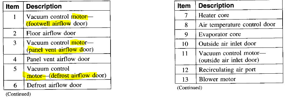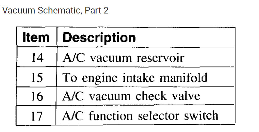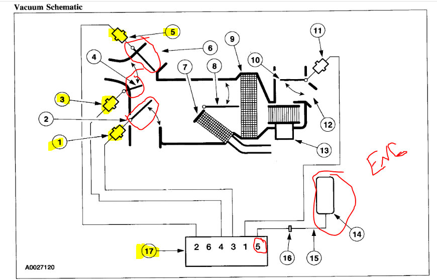 So, not to confuse you, I suspect we lost engine vacuum to the center control knob. See pic below. In the picture, number 17 is the control knob on the dash. Numbers 1, 3, and 5 are the different doors that move. I highlighted the vacuum motor and circled the doors. Based on the doors positioning determines the direction of air flow.