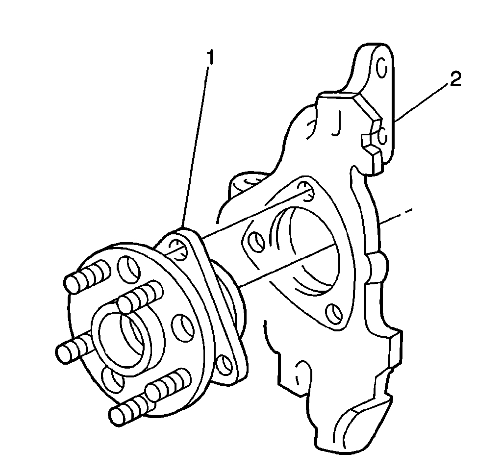 6. Remove the hub and bearing assembly (1) from the steering knuckle (2) and drive axle shaft.