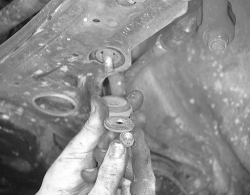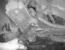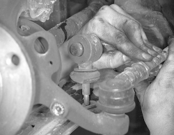 Install the bolts/nuts securing the outer ends of the sway bar. Tighten until just snug (they will be fully tightened later).