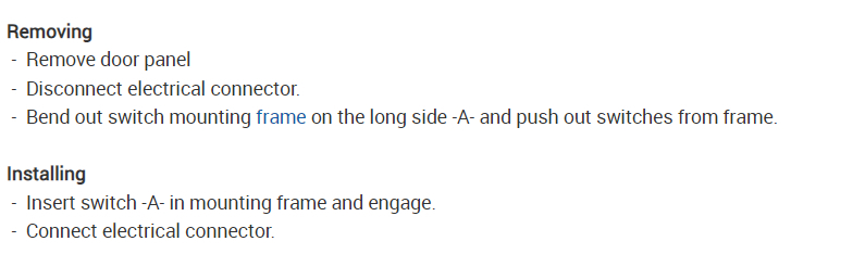 Looks like you remove the door panel and bend the tabs over and push the switch out