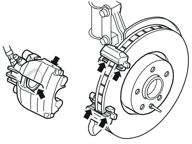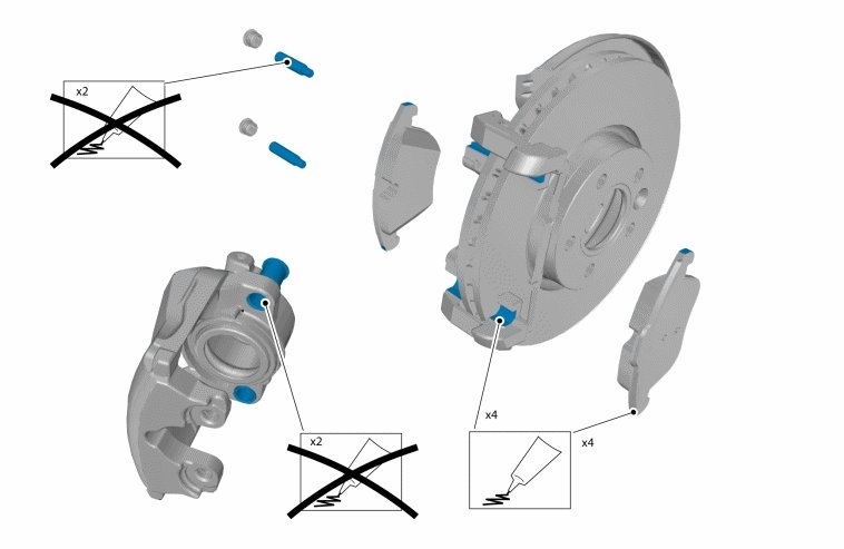 Lubricate the contact surfaces of the brake pads using silicone grease, part no. 1161687 (12 ml) or part no. 1161688 (50 ml)