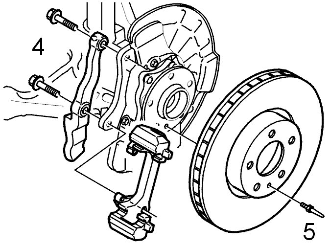 - both the mounting screws (4) for the caliper holder. Remove the holder