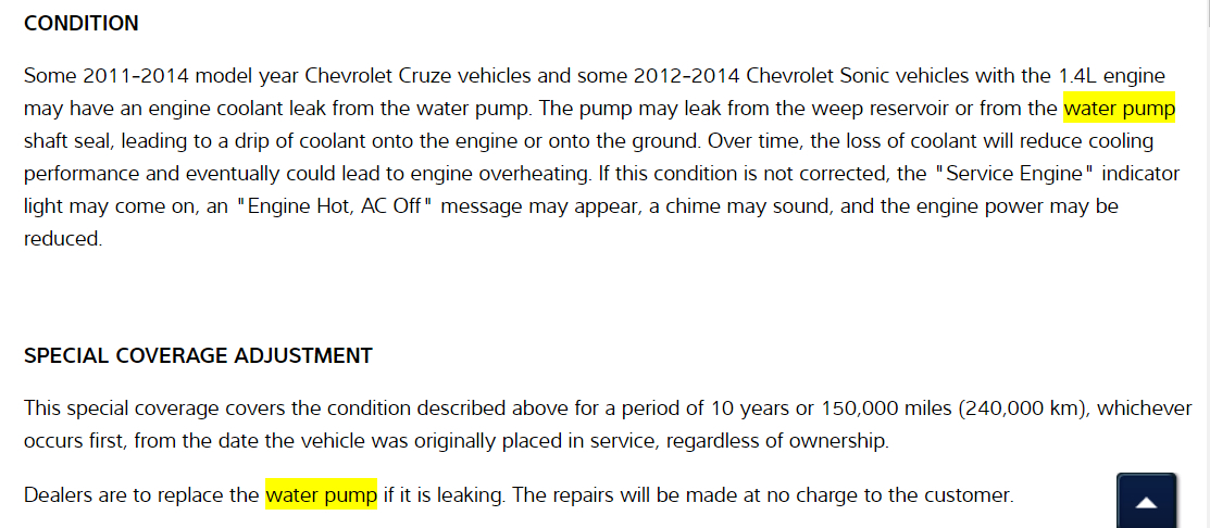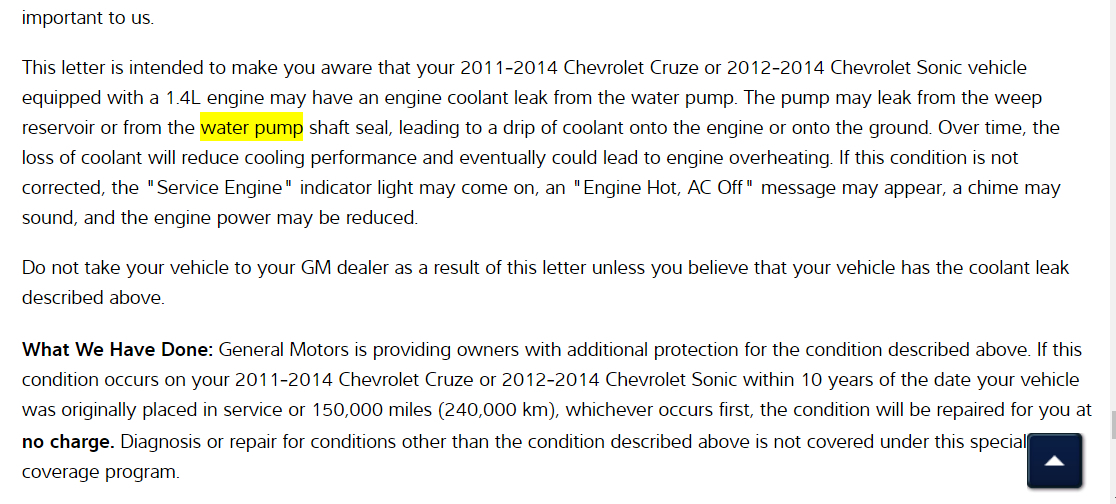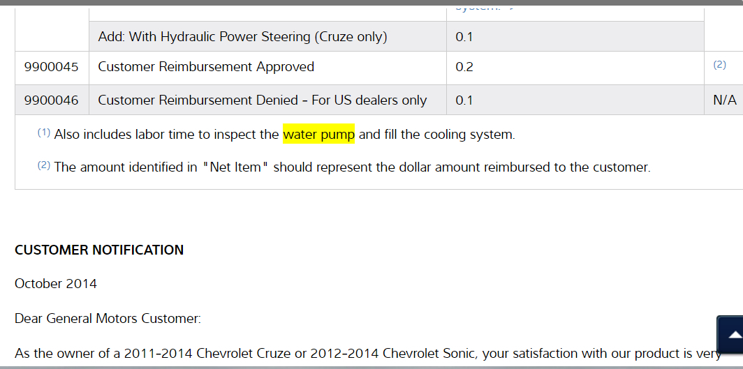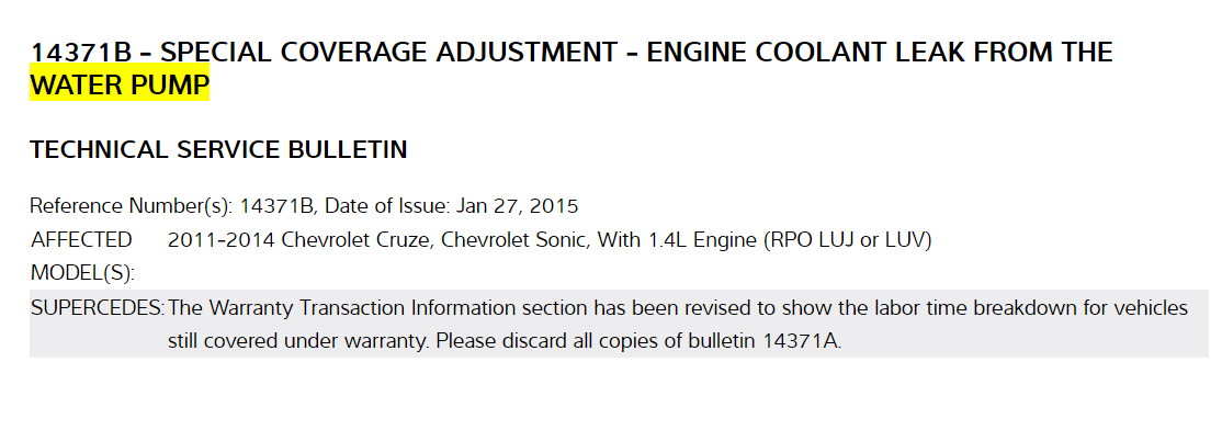 I hope that you have a 1.4L engine because as I was doing research on your vehicle I came across this Technical Service Bulletin (TSB) for a recall on your vehicle's water pump. You probably want to call your local dealership and inquire about having it replaced free of charge, I have included the TSB in the diagrams down below.