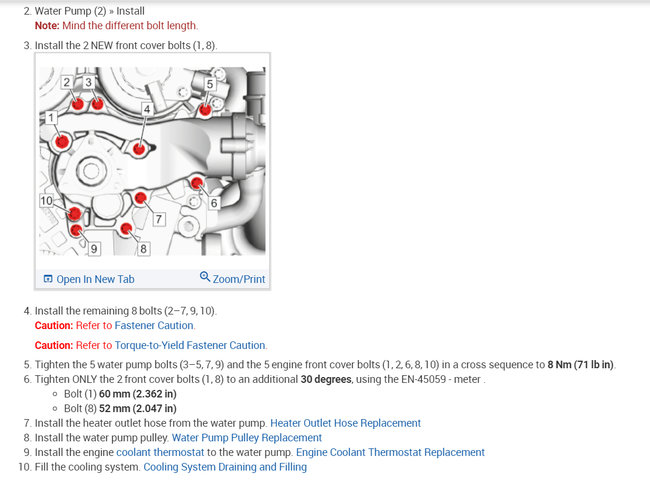 The water pump bolt can have oil on it because they go through to the engine crankcase. I have found the instructions on how to change the water pump out and here is the warning they give you when doing the job. There are three different engines that go in these, so I have found all three, they say not to over tighten the bolts and to mind the length of the bolts. Also, some of the bolts thread into plastic so be careful not to strip the bolts out. They do use to torque-to-yield or single use fasteners so you will need new bolts as well.