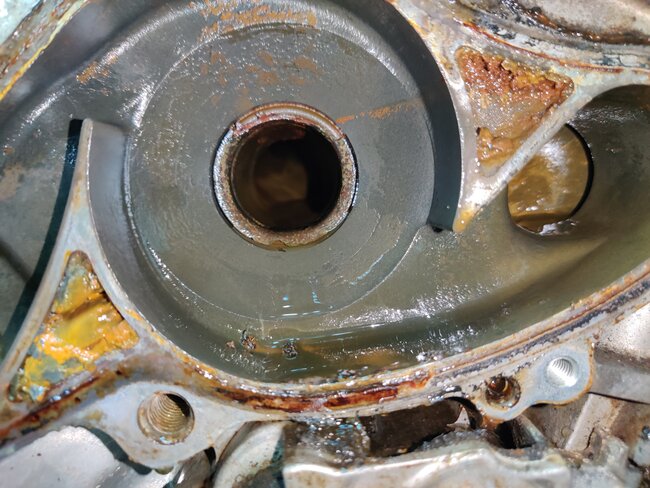 The impeller is completely destroyed and gone. The engine was overheating so we found at least 1 of the culprits. In the inlet passage there is what appears to be some kind of pressed in ring that is also damaged. It is also very corroded. Have never seen one of these damaged or look like it is not in completely straight.