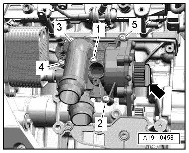 Side note, keep in mind If you take off the belt pulley that bolt is reverse threaded. So to loosen is clockwise as to not break the belt. The belt pulley bolt torque is 10 nm plus 1/4 turn or 90°, but if you loosen it then it recommends replacing it with a new one.