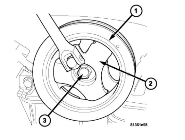 9. Starting with the right camshaft sprocket, remove the sprocket attaching bolts. Remove camshaft damper (1) (if equipped) and sprocket.