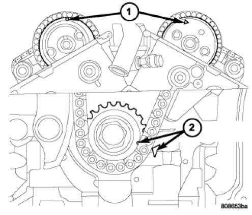 5. Align crankshaft sprocket timing mark to mark on oil pump housing (2). The mark on oil pump housing is 60° ATDC of #1 cylinder.