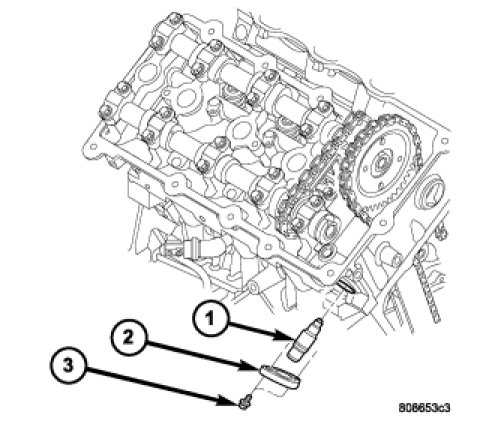 8. Remove timing chain guide access plugs (3) from cylinder heads.