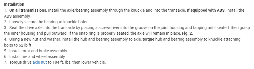 I attached directions for the replacement of a drive axle. I don't know if that was done or if the hub itself was replaced. However, the directions provide the needed torque specs.