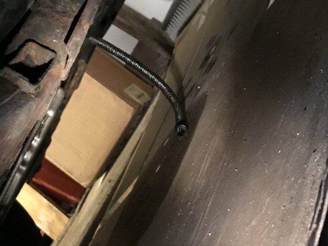 This looks to me like it might be wiring loom. I say this because of ribbing. Hoses don't usually come ribbed like that that I know of. See if it has an opening on one side and it is wrapped in friction tape to give it the appearance of a hose. Please get back to us with what you find out.
